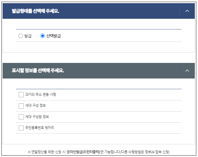 발행형태에서 '선택발급' 을 클릭하면 어떤 정보를 등본 위에 표시할 지 선택할 수 있습니다.