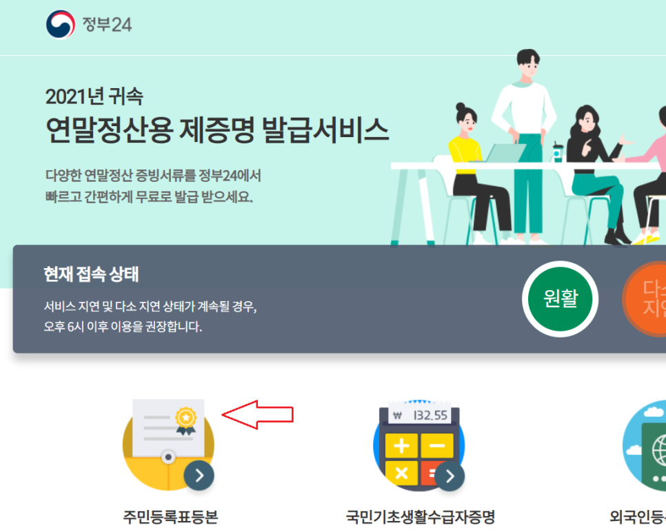 주민등록등본의 인터넷 발급을 위해 아래 빨간색 화살표를 붙여놓은 "주민등록등본"을 클릭합니다.
