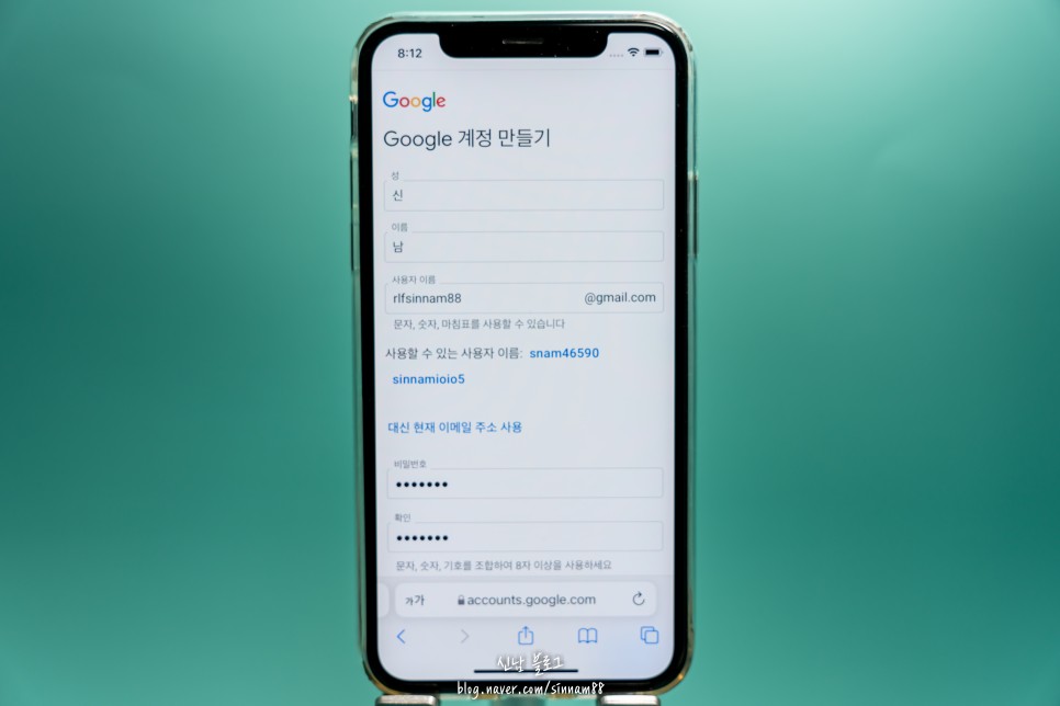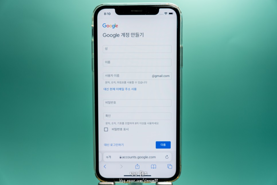 꼭 내 이름을 그대로 적을 필요 없이 사용자 이름 부분은 내가 구글 계정 만들기를 했던 아이디에 로그인 할 때 필요한 이름을 물어보는 겁니다.