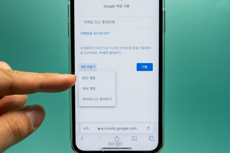 '계정 만들기'를 클릭하면 본인 계정 만들기, 자녀 아이디 만들기, 비즈니스 관리 등의 메뉴가 나타납니다.
