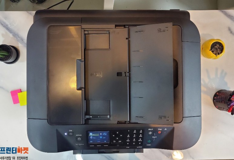 제품의 정면 사진 입니다.용지대를 펼쳐 주시면, 용지가 바닥에 떨어지지 않습니다.