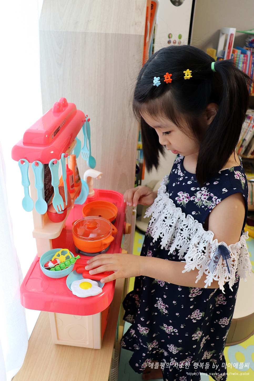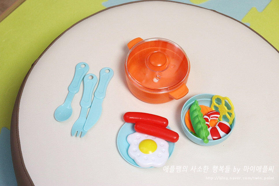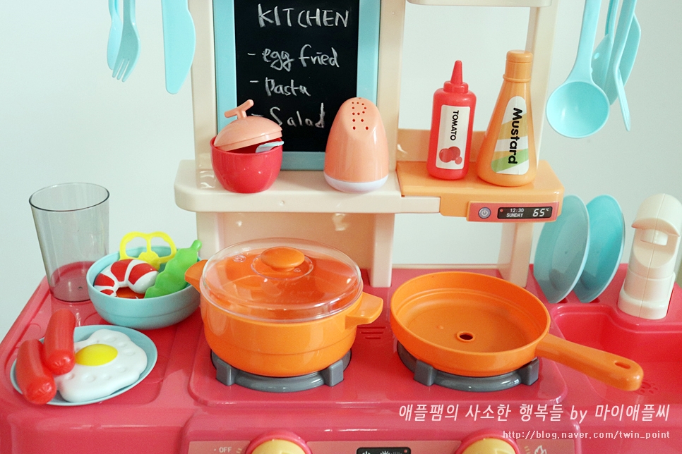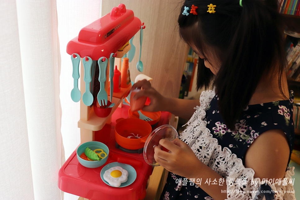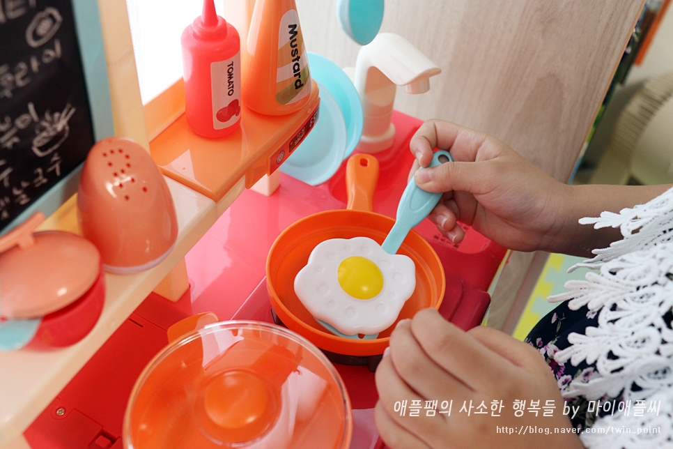 아무래도 거실에 둬야 아이들이 잘 놀 수 있고 다행히 try your likes 주방 놀이 세트는 들어갈 자리가 딱 좋다창가 쪽 단장 위에 올려놨더니 정말 네 자리가 갖고 싶어졌어. 특히 좀 높게 해놔서 애플 종의 높이에도 맞고 앉지 않고 놀 수 있었는데 키 작은 아기는 바닥에 내려놔도 놀 수 있을 것 같아서 오래 활용할 수 있을 것 같다. 지글지글 프라이팬에서 만드는 반숙 달걀 프라이 샐러드도 만들고 소스도 뿌리고 할 일이 많은 애플 셰프! 파프리카도 물로 깨끗이 씻고, 보글보글 냄비도 끓이고, 한동안 주방놀이에 흥미를 잃었던 애플 씨가 즐겁게 노는 모습을 보고, 매우 기뻤다. 적당하지는 않지만 디자인이 너무 귀엽고 색감도 너무 사랑스러울 정말 알짜 try your likes 주방 놀이 세트 좁은 집에 자리를 차지하지 않아서 더욱 만족하고 있다.