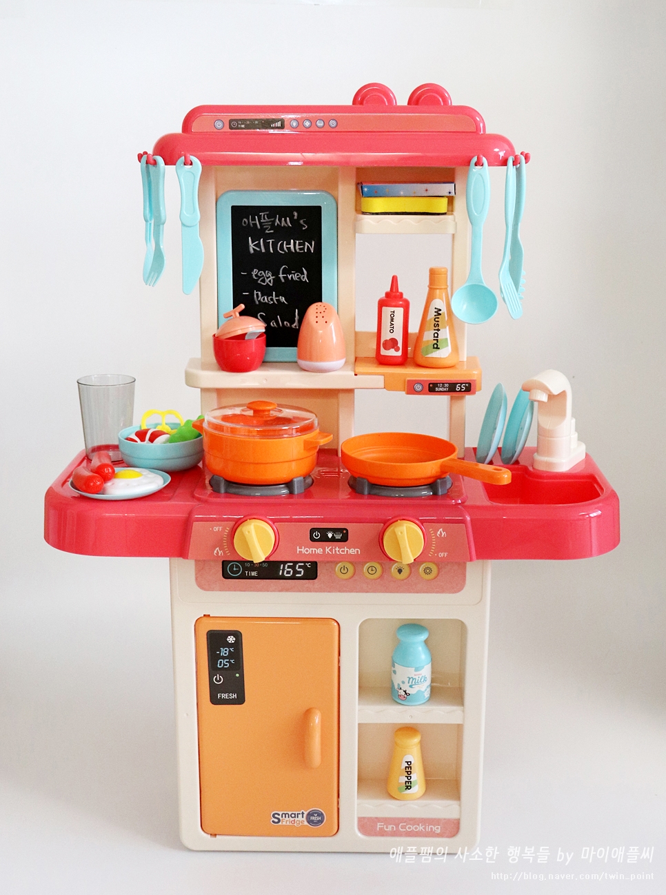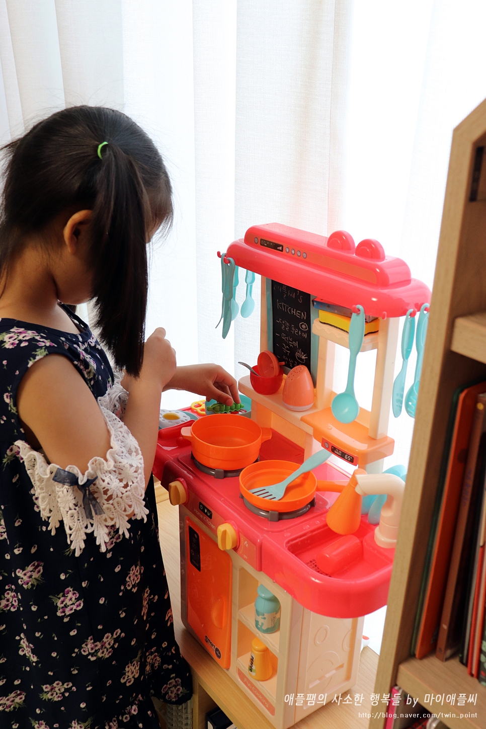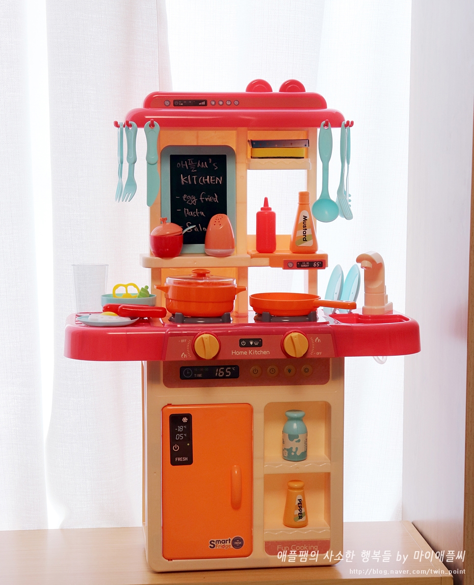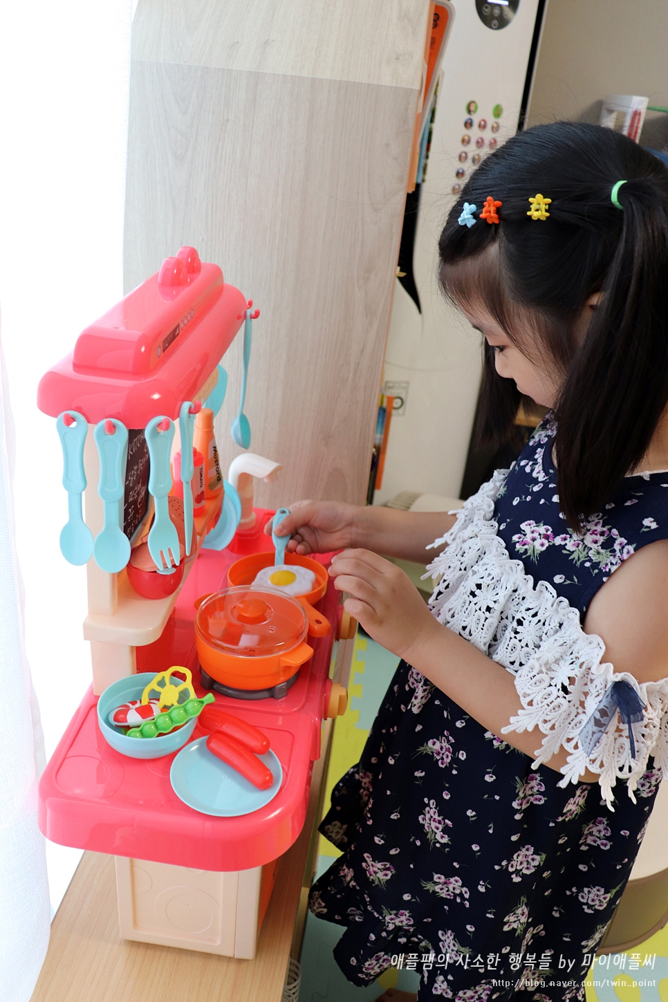 아무래도 거실에 둬야 아이들이 잘 놀 수 있고 다행히 try your likes 주방 놀이 세트는 들어갈 자리가 딱 좋다창가 쪽 단장 위에 올려놨더니 정말 네 자리가 갖고 싶어졌어. 특히 좀 높게 해놔서 애플 종의 높이에도 맞고 앉지 않고 놀 수 있었는데 키 작은 아기는 바닥에 내려놔도 놀 수 있을 것 같아서 오래 활용할 수 있을 것 같다. 지글지글 프라이팬에서 만드는 반숙 달걀 프라이 샐러드도 만들고 소스도 뿌리고 할 일이 많은 애플 셰프! 파프리카도 물로 깨끗이 씻고, 보글보글 냄비도 끓이고, 한동안 주방놀이에 흥미를 잃었던 애플 씨가 즐겁게 노는 모습을 보고, 매우 기뻤다. 적당하지는 않지만 디자인이 너무 귀엽고 색감도 너무 사랑스러울 정말 알짜 try your likes 주방 놀이 세트 좁은 집에 자리를 차지하지 않아서 더욱 만족하고 있다.