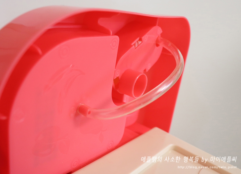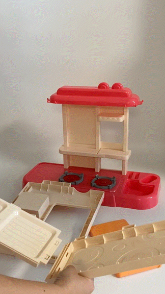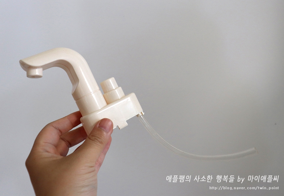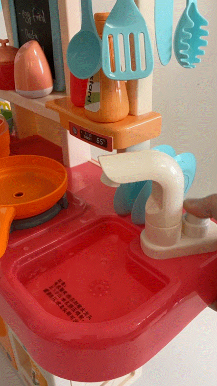 "이것은 싱크대의 물이 나오는 부분 그렇지만 아래에 투명관을 연결해야 한다." 역시 어렵지 않은 드라이버 렌치도 하나 필요 없는 모든 것을 손으로 쉽게 조립할 수 있는 try your likes 주방 놀이 세트다. 수전 꽂이 구멍의 가장 큰 구멍 쪽에 호스를 넣고 아래로 돌려 싱크대 밑의 작은 구멍에 연결하면 끝이다.그리고 물을 부어 사용하면 끊임없이 돌도 돌아가는 물이 생겨나게 된다. ㅎ 물이 세차게 나온다. 조금의 손길 작업이 필요하지만 덕분에 건전지에 물이 들어갈 걱정 없이 깨끗하게 물이 나오는 싱크대를 얻었다. 모든 세팅을 끝내고 모습! 나는 창의력이란건 없으니까 역시 박스에 있는 샘플사진대로. 그렇게 해둔 데는 분명히 이유가 있을 테니까.www