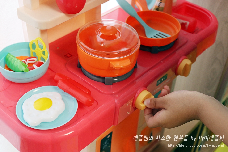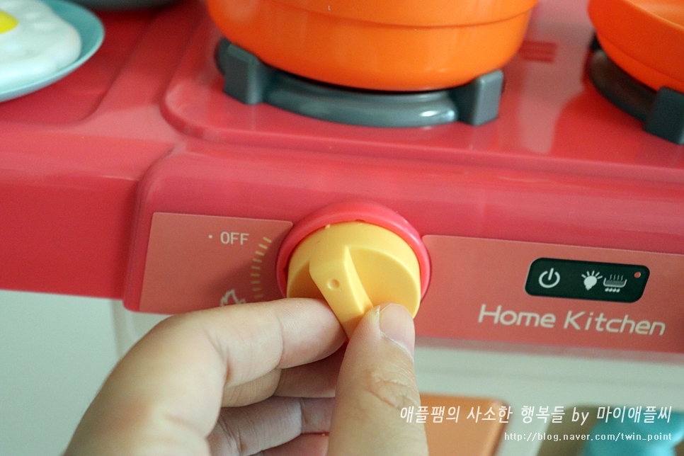 냄비나 프라이팬, 컵, 소스통 등 디테일이 꽤 좋은 편이다.호비교구 안에 소리가 나는 프라이팬이 있는데, 애플씨가 그것을 누가 주고 싶지 않다고 해서 가격을 낮춰서 팔았는데, 그럴 필요가 없었어.(눈물) 이렇게 가스레인지 손잡이를 불 그림 쪽으로 돌리면 보글보글 소리가 나며 붉게 빛도 난다. 소리와 빛을 들어보자아이들이 진짜 요리하는 듯한 느낌을 주기 때문에 생동감이 느껴진다.