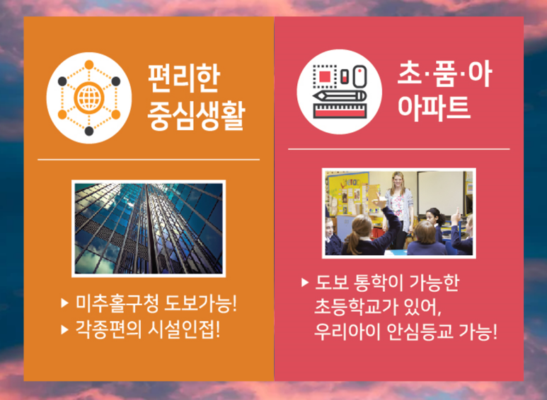 "용일시장, 제물포시장, 용현시장, 홈플러스에서 기성품을 구매할 수 있어 편리함도 우수합니다" 행정복지센터와 미추홀구청, 합동청사도 반경 1.5km 이내에 있어 행정업무를 처리하기 편리합니다.