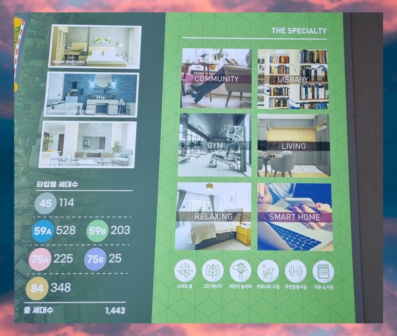 10개 동의 중앙에는 자연풍이 쉽게 불 수 있도록 놓여져 있습니다. 메인 출입구로 통하는 보도를 따라 걷다 보면 놀이터와 쉼터, 물가 및 프리미엄 커뮤니티 센터로 연결됩니다. 주민운동시설과 작은도서관 등으로 구성되어 있습니다.집의 내부는 외관뿐만 아니라 내부 시스템도 최신식으로 구성됩니다. IoT 스마트 홈 시스템을 스마트 폰으로 연동 할 수 있습니다. 그 덕분에 손쉽게 가전 및 전등을 조작할 수 있는 것이군요.