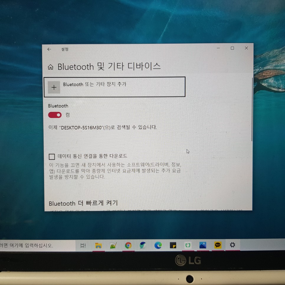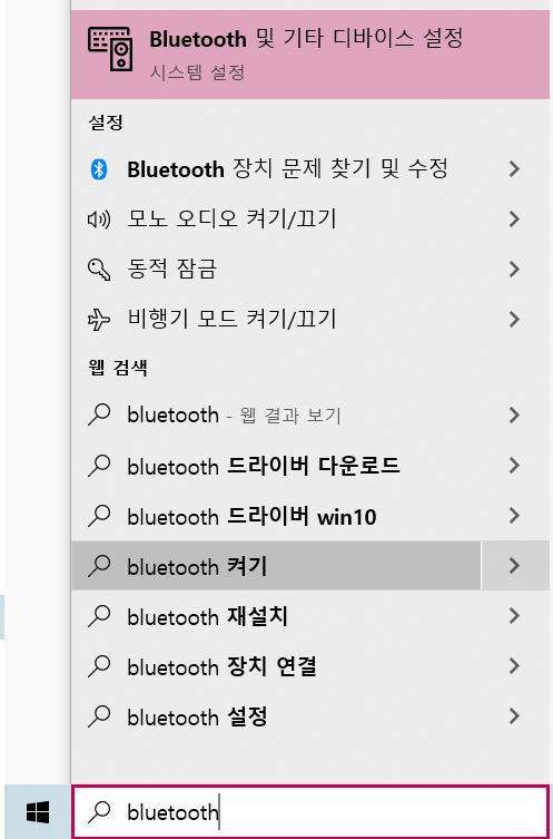 다른 방법으로는 검색 창에 블루투스를 입력하고 동작을 설정해 줍니다.