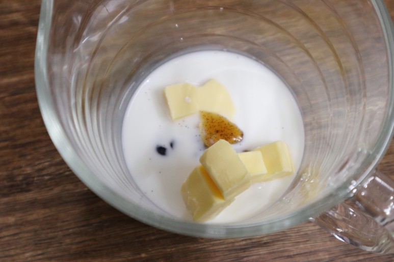 그 무렵 우유, 바닐라 익스트럭, 버터를 볼에 넣고 전자레인지 이용하거나 중탕하여 미리 따뜻하게 녹여둘게요