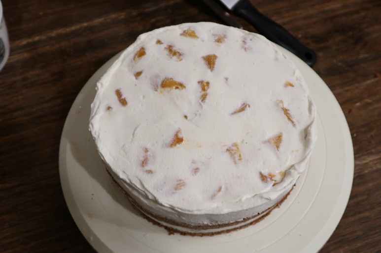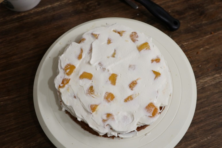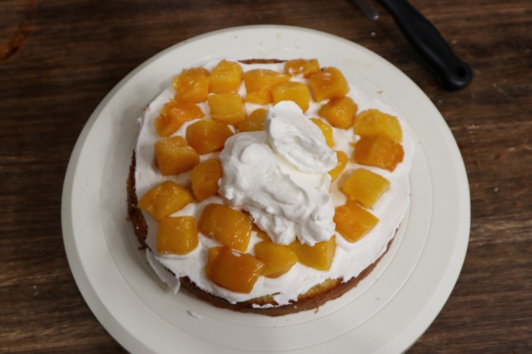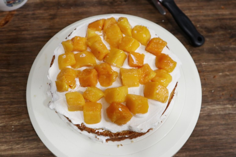 빈틈없이 망고를 올린 다음 크림을 올려서 평평하게 발라줍니다