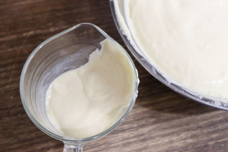 적당히 흐름이 있는 상태까지 휘핑 후 표면의 아이싱용으로 1/3정도를 따로 보관합니다.