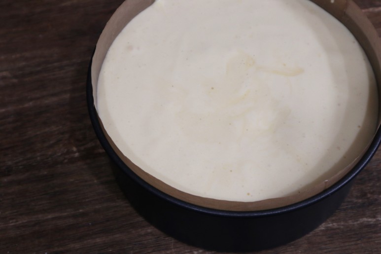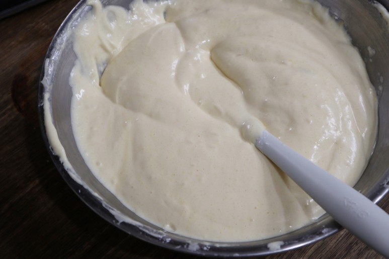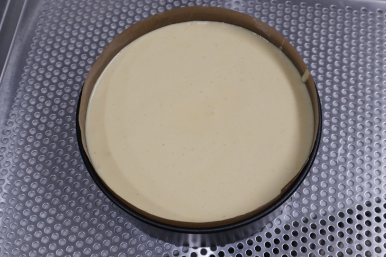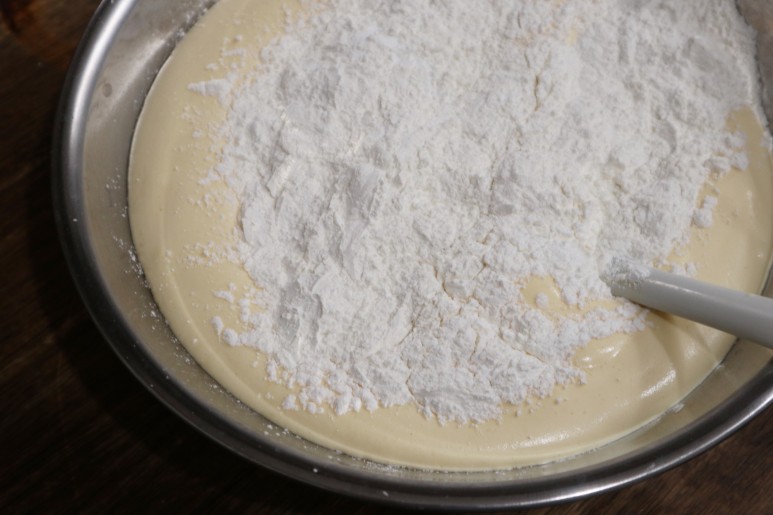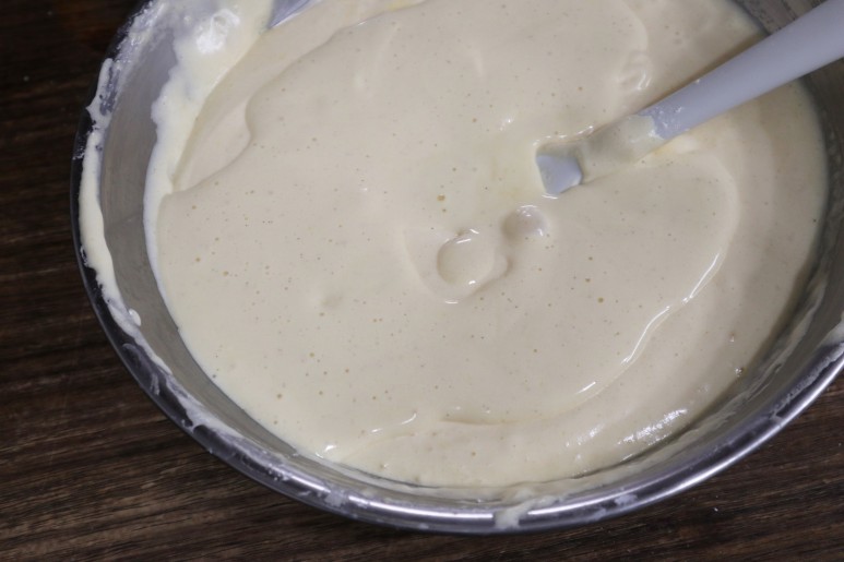 테프론시트 또는 쿠킹시트를 깐 팬에 미리 반죽을 붓고, 윗면의 포말 반죽을 가볍게 섞어 주십시오.