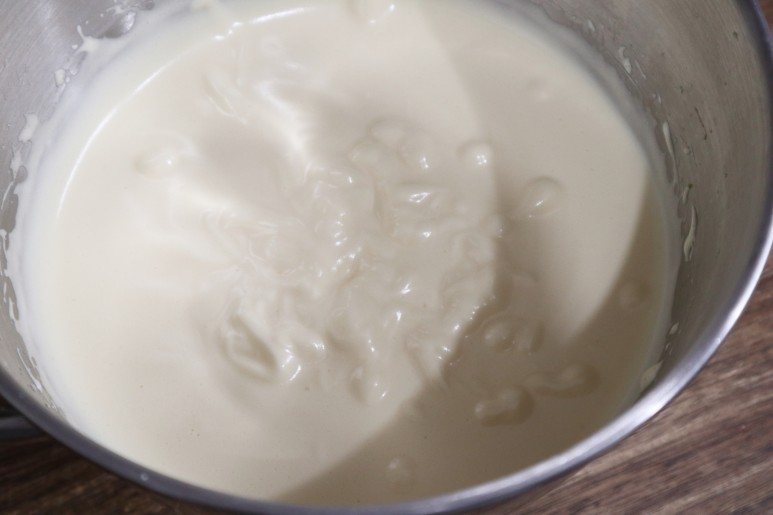아까 녹여놓은 우유+버터 혼합물이랑 섞을 거예요 버터 + 우유는 50도 정도에서 맞추고, 식으면 조금 더 데워주세요.반죽을 두어 그릇 섞은 다음 액체가 겉돌지 않도록 잘 저으세요